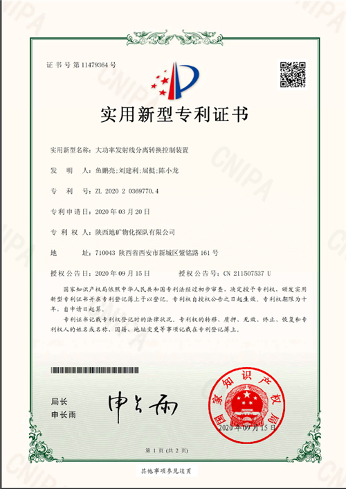 近日,物化探队申请的《大功率地面电磁法测量系统》与《大功率发射线分离转换控制装置》两项实用新型专利,获得国家知识产权局颁发的专利证书。