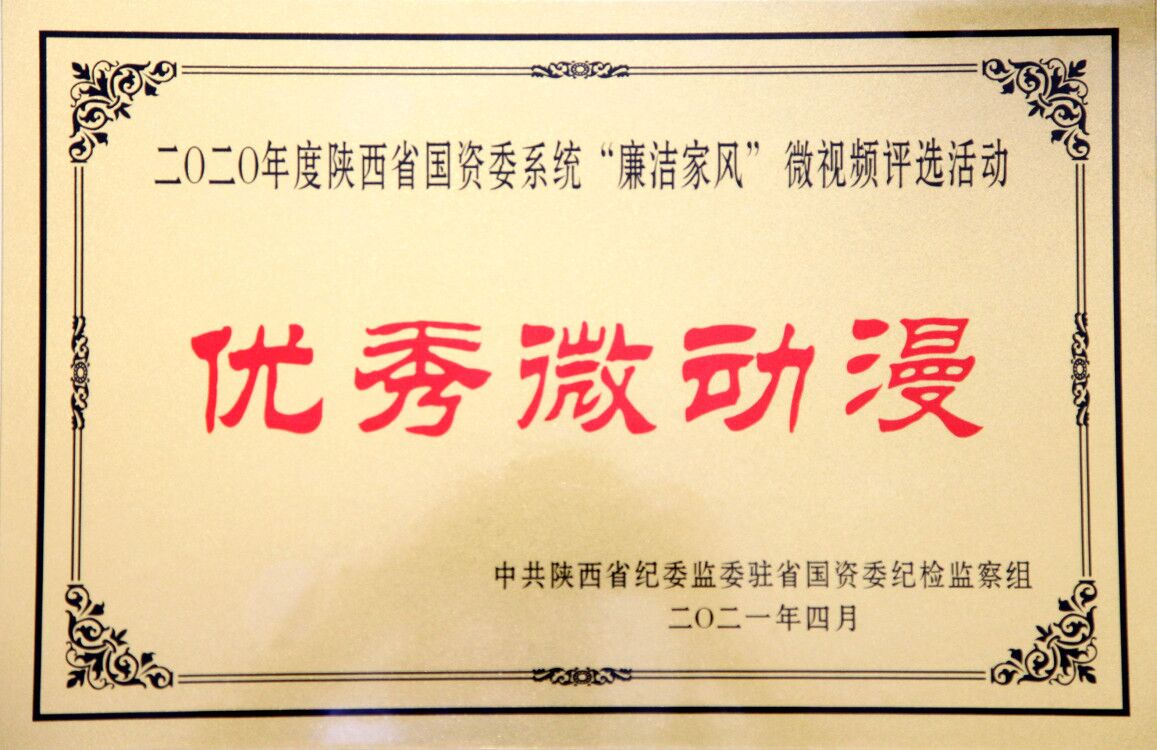 物化探队纪委制作的微动漫《弘扬好家风 传递正能量》,在陕西省国资委系统“廉洁家风”微视频评选活动中,荣获中共陕西省纪委监委驻省国资委纪委检查组颁发的“优秀微动漫”奖。