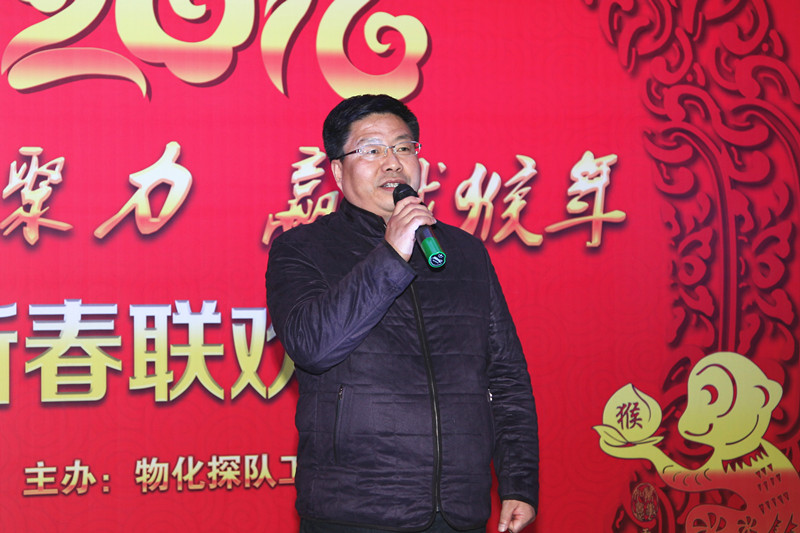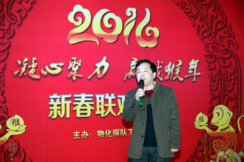 队长王新坪致新春贺词,他说:2015年在总公司的正确领导下,物化探队创新发展,各项工作取得了显著的成绩。2016年按照总公司的新要求和物化探队“大地质 大物探 大发展”的经营思路,凝心聚力,攻坚克难, 赢战2106。全体干部职工一定要奋力搏击,敢于担当,携手同心,用智慧和汗水共谱物化探队新篇章!王新坪代表物化探队领导班子,祝全队职工在猴年来临之际,身体健康,阖家幸福,生活美满,事业有成。