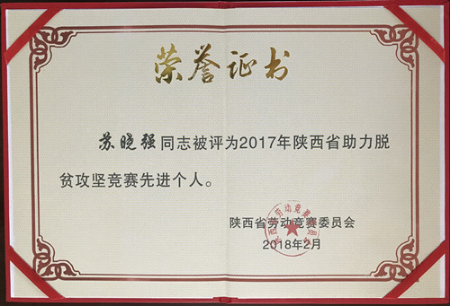 在2018年初陕西省劳动竞赛委员会开展的助力脱贫攻坚竞赛中,苏晓强同志被授予“陕西省助力脱贫攻坚竞赛先进个人”荣誉称号。